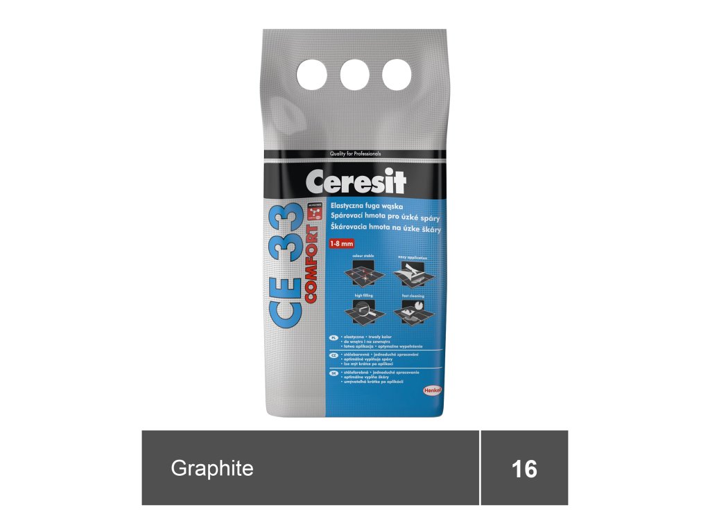 CERESIT CE 33 Comfort ve vyobrazené graphite barvě je spárovací hmota pro spárování keramických obkladů a dlažeb pro spáry s šířkou do 8 mm.