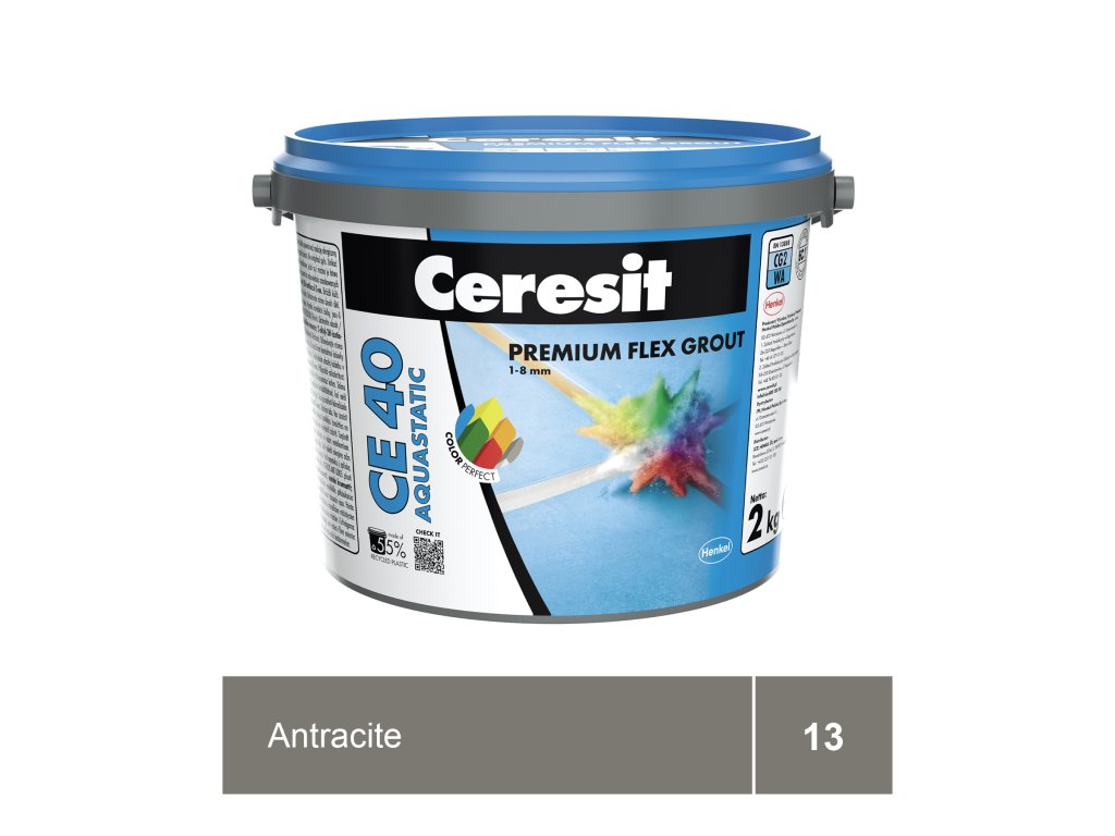 CERESIT CE 40 Aquastatic 2 kg ve vyobrazené barvě antracite je spárovací hmota s inovativní polymerovou technologií Silica Active zaručuje optimální čas vytvrzování u gresových i keramických dlažeb, vysokou odolnost vůči vzniku trhlin a poškrábání a zároveň dokonalou stálost a intenzitu barev bez výkvětů. Navíc zvýšená odolnost vůči poškrábání a vzniku prasklin zaručuje dlouhodobou životnost spáry a ve spojení s Trojitou ochranou MicroProtect je navíc účinně chráněna proti houbám a plísním. Díky schopnosti utěsnit povrch proti průniku vody (efekt Aquastatic) zůstávají kapky na povrchu spáry a nevsakují se do její struktury, což zvyšuje odolnost vůči plísním a poškození.