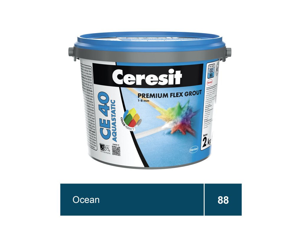 CERESIT CE 40 Aquastatic 2 kg ve vyobrazené barvě ocean je spárovací hmota s inovativní polymerovou technologií Silica Active zaručuje optimální čas vytvrzování u gresových i keramických dlažeb, vysokou odolnost vůči vzniku trhlin a poškrábání a zároveň dokonalou stálost a intenzitu barev bez výkvětů. Navíc zvýšená odolnost vůči poškrábání a vzniku prasklin zaručuje dlouhodobou životnost spáry a ve spojení s Trojitou ochranou MicroProtect je navíc účinně chráněna proti houbám a plísním. Díky schopnosti utěsnit povrch proti průniku vody (efekt Aquastatic) zůstávají kapky na povrchu spáry a nevsakují se do její struktury, což zvyšuje odolnost vůči plísním a poškození.