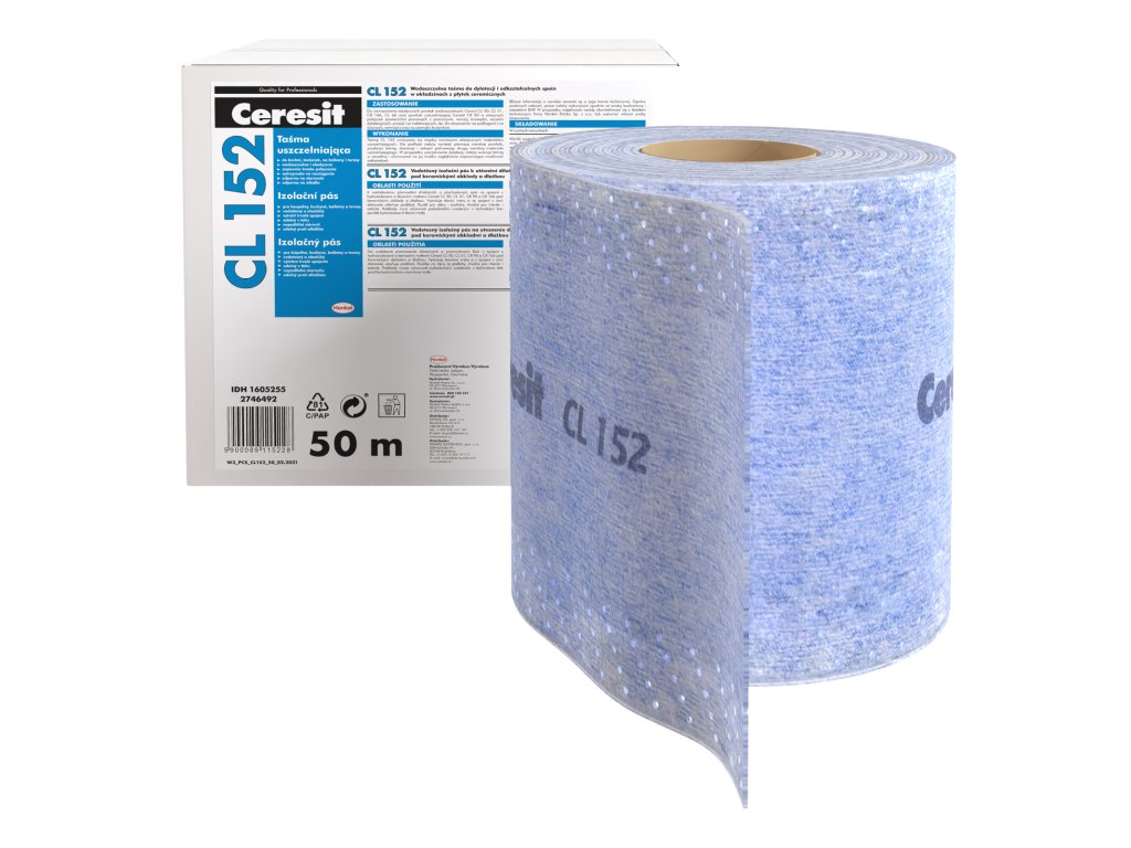 CERESIT CL 152 izolační pás 50 m - pro vodotěsné přemostění dilatačních a přechodových spár ve spojení s utěsňujícími produkty Ceresit CL 50 a CL 51 pod keramické obklady a dlažbu. Vyztužuje těsnicí vrstvy a ve spojení s nimi dokonale utěsňuje podklad. Použití pro podlahy i stěny, koupelny, sprchy, balkóny, terasy. Použití v interiéru i exteriéru.