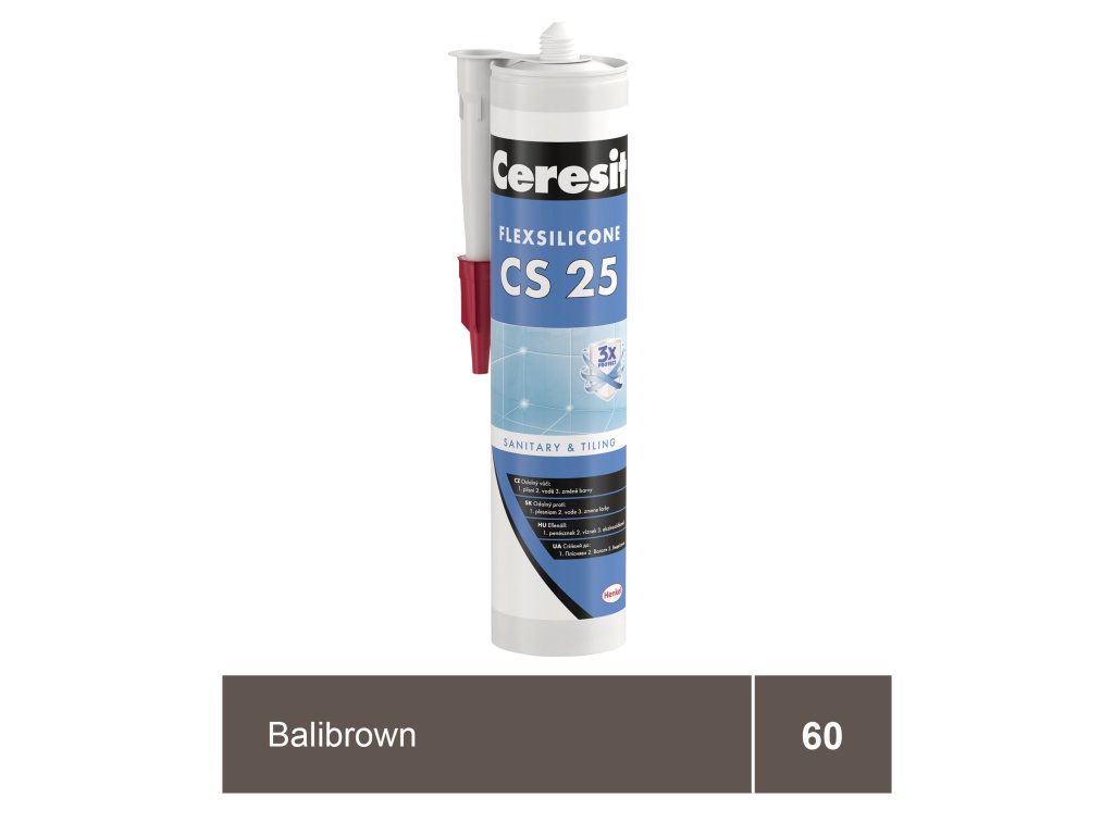 Sanitární silikon Ceresit CS 25 ve vyobrazené balibrown barvě je určen pro vyplnění dilatačních a spojovacích spár mezi keramickými obklady a dlažbami v rozích nebo ve styku stěn, podlah a k usazování zařizovacích předmětů v sanitární oblasti. Je určen k vyplňování spár tam, kde běžné spárovací hmoty vykazují trhliny a praskliny. Díky trvalé elasticitě a odolnosti proti vodě je vhodný do oblastí trvale zatížených vlhkostí, jako např.: kuchyně, sprchy, koupelny, toalety, balkóny, terasy apod. Sanitární silikon Ceresit CS 25 SANITARY s recepturou MicroProtect obsahuje v porovnání s dosud standartním silikonům trojnásobné množství protiplísňových přísad a díky efektu Aquastatik zaručuje, že se na povrchu cementových spár nemůže držet voda, čímž poskytuje dlouhodobou ochranu proti vzniku plísní a jejich působení. Spáry tak zůstávají čisté a zdraví neškodné. Materiál má vynikající přídržnost k suchým i nesavým podkladům jako sklo, keramika, porcelán, pórovina, email apod. Není vhodný pro použití v nádržích na pitnou vodu a pro lepení akvárií, zrcadel a kovů podléhajících korozi (jako olovo, zinek, měď, železo).
