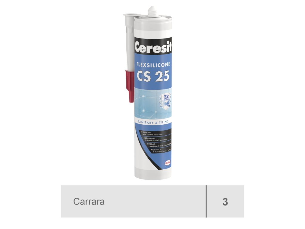 Sanitární silikon Ceresit CS 25 ve vyobrazené barvě carrara je určen pro vyplnění dilatačních a spojovacích spár mezi keramickými obklady a dlažbami v rozích nebo ve styku stěn, podlah a k usazování zařizovacích předmětů v sanitární oblasti. Je určen k vyplňování spár tam, kde běžné spárovací hmoty vykazují trhliny a praskliny. Díky trvalé elasticitě a odolnosti proti vodě je vhodný do oblastí trvale zatížených vlhkostí, jako např.: kuchyně, sprchy, koupelny, toalety, balkóny, terasy apod. Sanitární silikon Ceresit CS 25 SANITARY s recepturou MicroProtect obsahuje v porovnání s dosud standartním silikonům trojnásobné množství protiplísňových přísad a díky efektu Aquastatik zaručuje, že se na povrchu cementových spár nemůže držet voda, čímž poskytuje dlouhodobou ochranu proti vzniku plísní a jejich působení. Spáry tak zůstávají čisté a zdraví neškodné. Materiál má vynikající přídržnost k suchým i nesavým podkladům jako sklo, keramika, porcelán, pórovina, email apod. Není vhodný pro použití v nádržích na pitnou vodu a pro lepení akvárií, zrcadel a kovů podléhajících korozi (jako olovo, zinek, měď, železo).