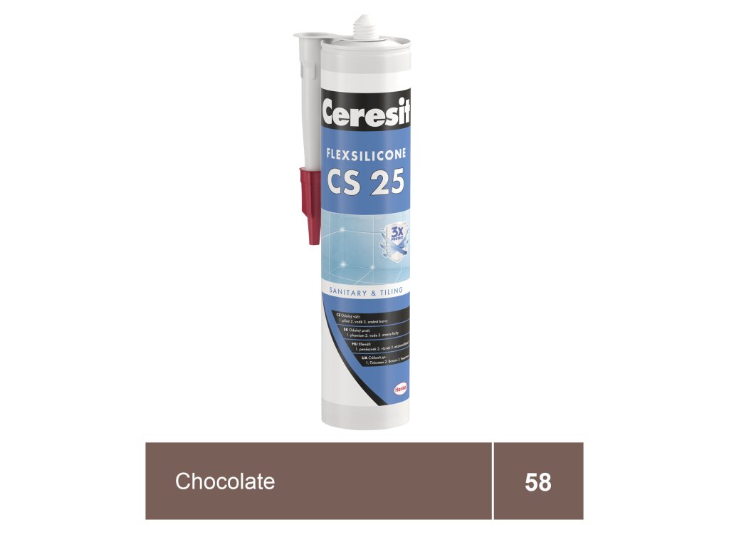 Sanitární silikon Ceresit CS 25 ve vyobrazené chocolate barvě je určen pro vyplnění dilatačních a spojovacích spár mezi keramickými obklady a dlažbami v rozích nebo ve styku stěn, podlah a k usazování zařizovacích předmětů v sanitární oblasti. Je určen k vyplňování spár tam, kde běžné spárovací hmoty vykazují trhliny a praskliny. Díky trvalé elasticitě a odolnosti proti vodě je vhodný do oblastí trvale zatížených vlhkostí, jako např.: kuchyně, sprchy, koupelny, toalety, balkóny, terasy apod. Sanitární silikon Ceresit CS 25 SANITARY s recepturou MicroProtect obsahuje v porovnání s dosud standartním silikonům trojnásobné množství protiplísňových přísad a díky efektu Aquastatik zaručuje, že se na povrchu cementových spár nemůže držet voda, čímž poskytuje dlouhodobou ochranu proti vzniku plísní a jejich působení. Spáry tak zůstávají čisté a zdraví neškodné. Materiál má vynikající přídržnost k suchým i nesavým podkladům jako sklo, keramika, porcelán, pórovina, email apod. Není vhodný pro použití v nádržích na pitnou vodu a pro lepení akvárií, zrcadel a kovů podléhajících korozi (jako olovo, zinek, měď, železo).