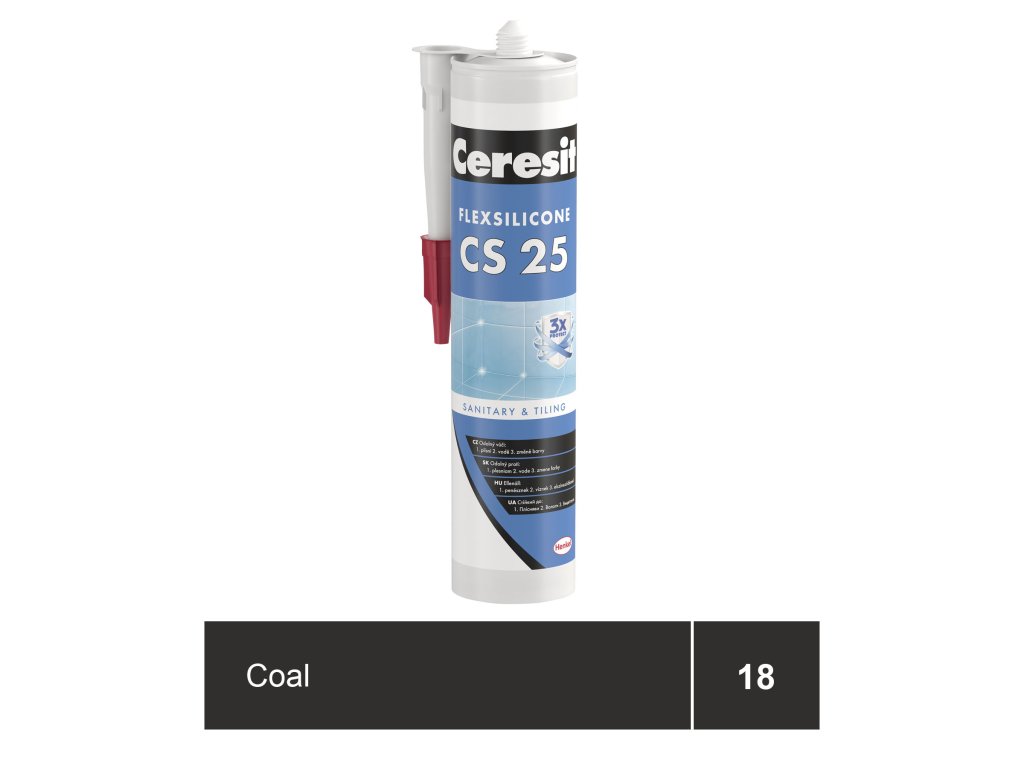 Sanitární silikon Ceresit CS 25 ve vyobrazené barvě coal je určen pro vyplnění dilatačních a spojovacích spár mezi keramickými obklady a dlažbami v rozích nebo ve styku stěn, podlah a k usazování zařizovacích předmětů v sanitární oblasti. Je určen k vyplňování spár tam, kde běžné spárovací hmoty vykazují trhliny a praskliny. Díky trvalé elasticitě a odolnosti proti vodě je vhodný do oblastí trvale zatížených vlhkostí, jako např.: kuchyně, sprchy, koupelny, toalety, balkóny, terasy apod. Sanitární silikon Ceresit CS 25 SANITARY s recepturou MicroProtect obsahuje v porovnání s dosud standartním silikonům trojnásobné množství protiplísňových přísad a díky efektu Aquastatik zaručuje, že se na povrchu cementových spár nemůže držet voda, čímž poskytuje dlouhodobou ochranu proti vzniku plísní a jejich působení. Spáry tak zůstávají čisté a zdraví neškodné. Materiál má vynikající přídržnost k suchým i nesavým podkladům jako sklo, keramika, porcelán, pórovina, email apod. Není vhodný pro použití v nádržích na pitnou vodu a pro lepení akvárií, zrcadel a kovů podléhajících korozi (jako olovo, zinek, měď, železo).