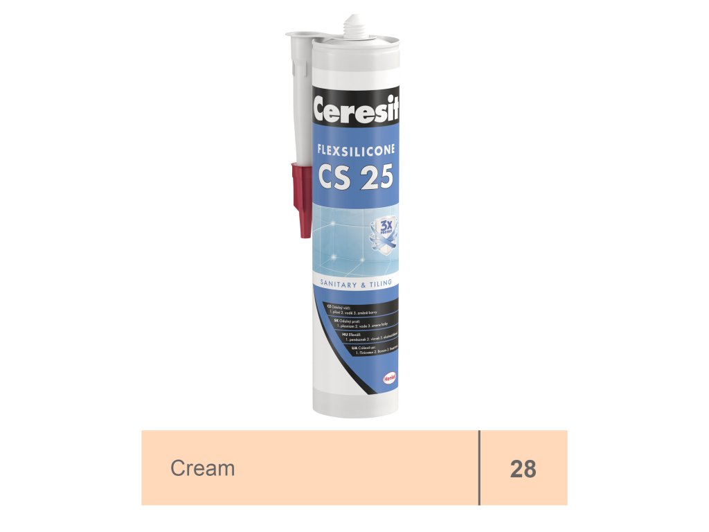 Sanitární silikon Ceresit CS 25 ve vyobrazené cream barvě je určen pro vyplnění dilatačních a spojovacích spár mezi keramickými obklady a dlažbami v rozích nebo ve styku stěn, podlah a k usazování zařizovacích předmětů v sanitární oblasti. Je určen k vyplňování spár tam, kde běžné spárovací hmoty vykazují trhliny a praskliny. Díky trvalé elasticitě a odolnosti proti vodě je vhodný do oblastí trvale zatížených vlhkostí, jako např.: kuchyně, sprchy, koupelny, toalety, balkóny, terasy apod. Sanitární silikon Ceresit CS 25 SANITARY s recepturou MicroProtect obsahuje v porovnání s dosud standartním silikonům trojnásobné množství protiplísňových přísad a díky efektu Aquastatik zaručuje, že se na povrchu cementových spár nemůže držet voda, čímž poskytuje dlouhodobou ochranu proti vzniku plísní a jejich působení. Spáry tak zůstávají čisté a zdraví neškodné. Materiál má vynikající přídržnost k suchým i nesavým podkladům jako sklo, keramika, porcelán, pórovina, email apod. Není vhodný pro použití v nádržích na pitnou vodu a pro lepení akvárií, zrcadel a kovů podléhajících korozi (jako olovo, zinek, měď, železo).
