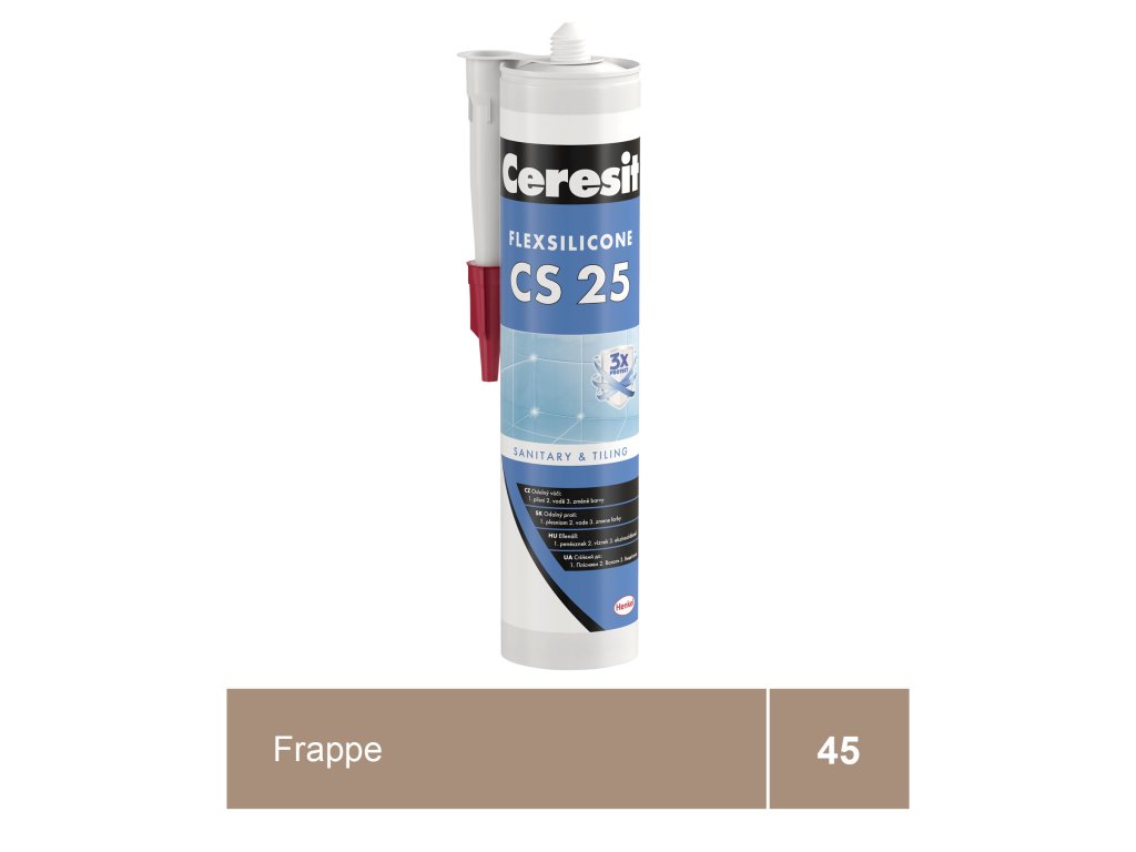 Sanitární silikon Ceresit CS 25 ve vyobrazené frappe barvě je určen pro vyplnění dilatačních a spojovacích spár mezi keramickými obklady a dlažbami v rozích nebo ve styku stěn, podlah a k usazování zařizovacích předmětů v sanitární oblasti. Je určen k vyplňování spár tam, kde běžné spárovací hmoty vykazují trhliny a praskliny. Díky trvalé elasticitě a odolnosti proti vodě je vhodný do oblastí trvale zatížených vlhkostí, jako např.: kuchyně, sprchy, koupelny, toalety, balkóny, terasy apod. Sanitární silikon Ceresit CS 25 SANITARY s recepturou MicroProtect obsahuje v porovnání s dosud standartním silikonům trojnásobné množství protiplísňových přísad a díky efektu Aquastatik zaručuje, že se na povrchu cementových spár nemůže držet voda, čímž poskytuje dlouhodobou ochranu proti vzniku plísní a jejich působení. Spáry tak zůstávají čisté a zdraví neškodné. Materiál má vynikající přídržnost k suchým i nesavým podkladům jako sklo, keramika, porcelán, pórovina, email apod. Není vhodný pro použití v nádržích na pitnou vodu a pro lepení akvárií, zrcadel a kovů podléhajících korozi (jako olovo, zinek, měď, železo).