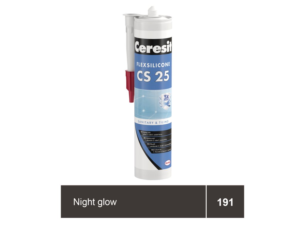 Sanitární silikon Ceresit CS 25 ve vyobrazené night glow barvě je určen pro vyplnění dilatačních a spojovacích spár mezi keramickými obklady a dlažbami v rozích nebo ve styku stěn, podlah a k usazování zařizovacích předmětů v sanitární oblasti. Je určen k vyplňování spár tam, kde běžné spárovací hmoty vykazují trhliny a praskliny. Díky trvalé elasticitě a odolnosti proti vodě je vhodný do oblastí trvale zatížených vlhkostí, jako např.: kuchyně, sprchy, koupelny, toalety, balkóny, terasy apod. Sanitární silikon Ceresit CS 25 SANITARY s recepturou MicroProtect obsahuje v porovnání s dosud standartním silikonům trojnásobné množství protiplísňových přísad a díky efektu Aquastatik zaručuje, že se na povrchu cementových spár nemůže držet voda, čímž poskytuje dlouhodobou ochranu proti vzniku plísní a jejich působení. Spáry tak zůstávají čisté a zdraví neškodné. Materiál má vynikající přídržnost k suchým i nesavým podkladům jako sklo, keramika, porcelán, pórovina, email apod. Není vhodný pro použití v nádržích na pitnou vodu a pro lepení akvárií, zrcadel a kovů podléhajících korozi (jako olovo, zinek, měď, železo).