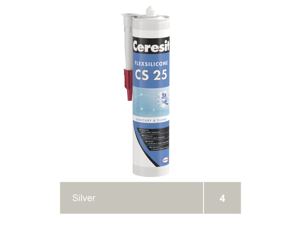 Sanitární silikon Ceresit CS 25 ve vyobrazené silver barvě je určen pro vyplnění dilatačních a spojovacích spár mezi keramickými obklady a dlažbami v rozích nebo ve styku stěn, podlah a k usazování zařizovacích předmětů v sanitární oblasti. Je určen k vyplňování spár tam, kde běžné spárovací hmoty vykazují trhliny a praskliny. Díky trvalé elasticitě a odolnosti proti vodě je vhodný do oblastí trvale zatížených vlhkostí, jako např.: kuchyně, sprchy, koupelny, toalety, balkóny, terasy apod. Sanitární silikon Ceresit CS 25 SANITARY s recepturou MicroProtect obsahuje v porovnání s dosud standardním silikonům trojnásobné množství protiplísňových přísad a díky efektu Aquastatik zaručuje, že se na povrchu cementových spár nemůže držet voda, čímž poskytuje dlouhodobou ochranu proti vzniku plísní a jejich působení. Spáry tak zůstávají čisté a zdraví neškodné. Materiál má vynikající přídržnost k suchým i nesavým podkladům jako sklo, keramika, porcelán, pórovina, email apod. Není vhodný pro použití v nádržích na pitnou vodu a pro lepení akvárií, zrcadel a kovů podléhajících korozi (jako olovo, zinek, měď, železo).