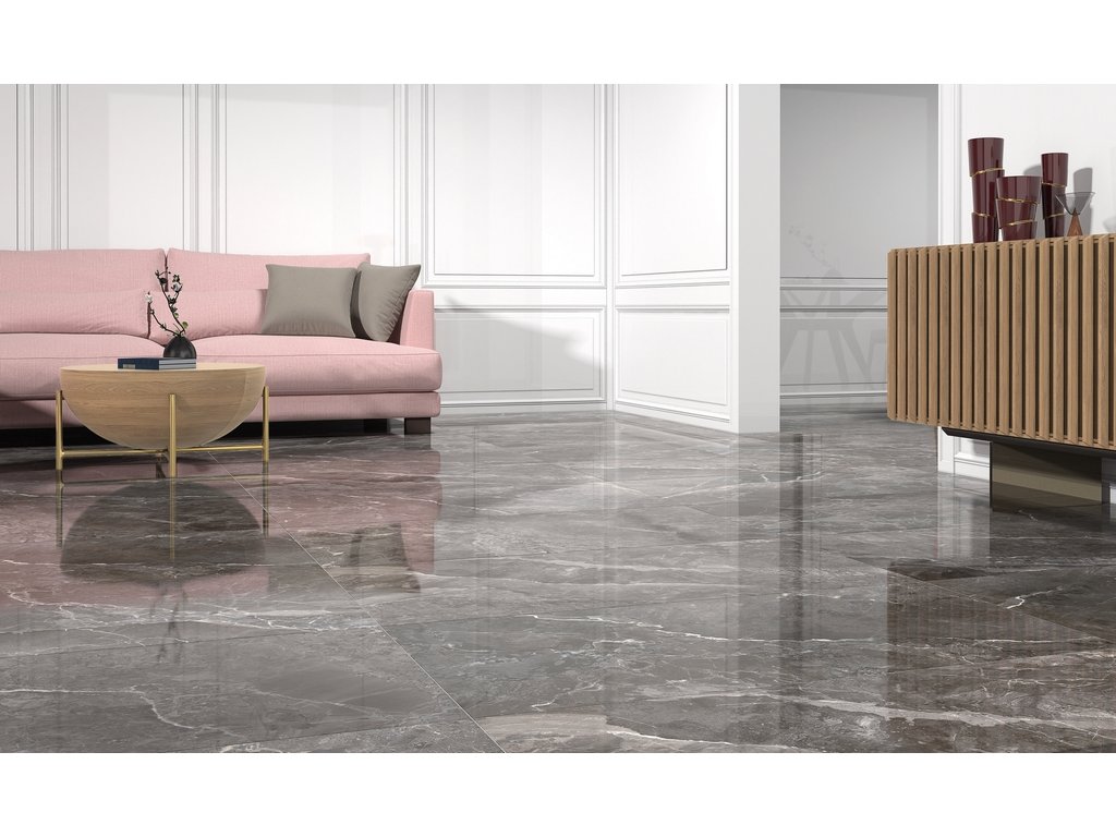 Velkoformátová šedá dlažba v imitaci mramoru Earthstone Graphite nabízí elegantní a stále oblíbený design, který oživí jakýkoliv interiér. Dlažbu díky zabroušení hran (kalibrování) lze pokládat s minimální spárou.